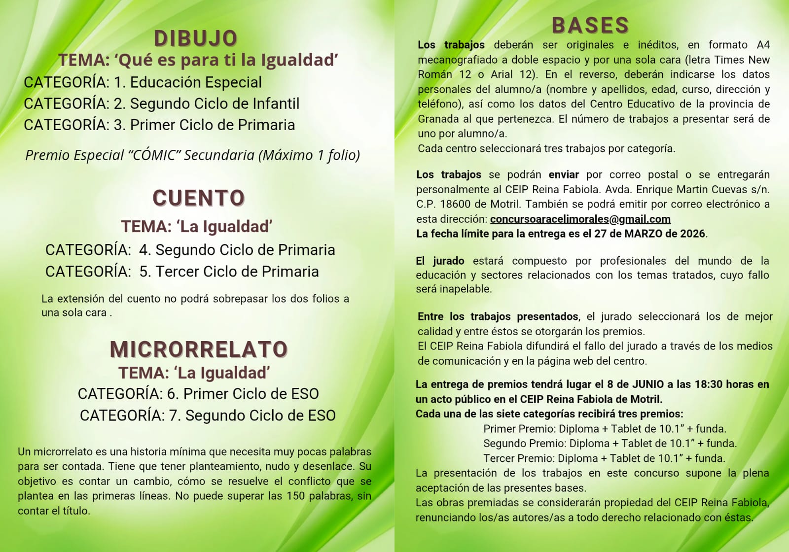 Desde la dirección del CEIP Reina Fabiola informan que los trabajos deberán ser originales e inéditos, en formato A4 mecanografiado y por una sola cara con letra Times New Roman 12 o Arial 12. Cada centro seleccionará tres trabajos por categoría y los ganadores recibirán como primer, segundo y tercer premio un diploma, una tablet de 10.1 pulgadas y su respectiva funda. La fecha límite para la entrega de los trabajos será el próximo 26 de marzo y deberán entregarse por correo postal, personalmente en el CEIP Reina Fabiola o a través de correo electrónico a la dirección concursoaracelimorales@gmail.com.