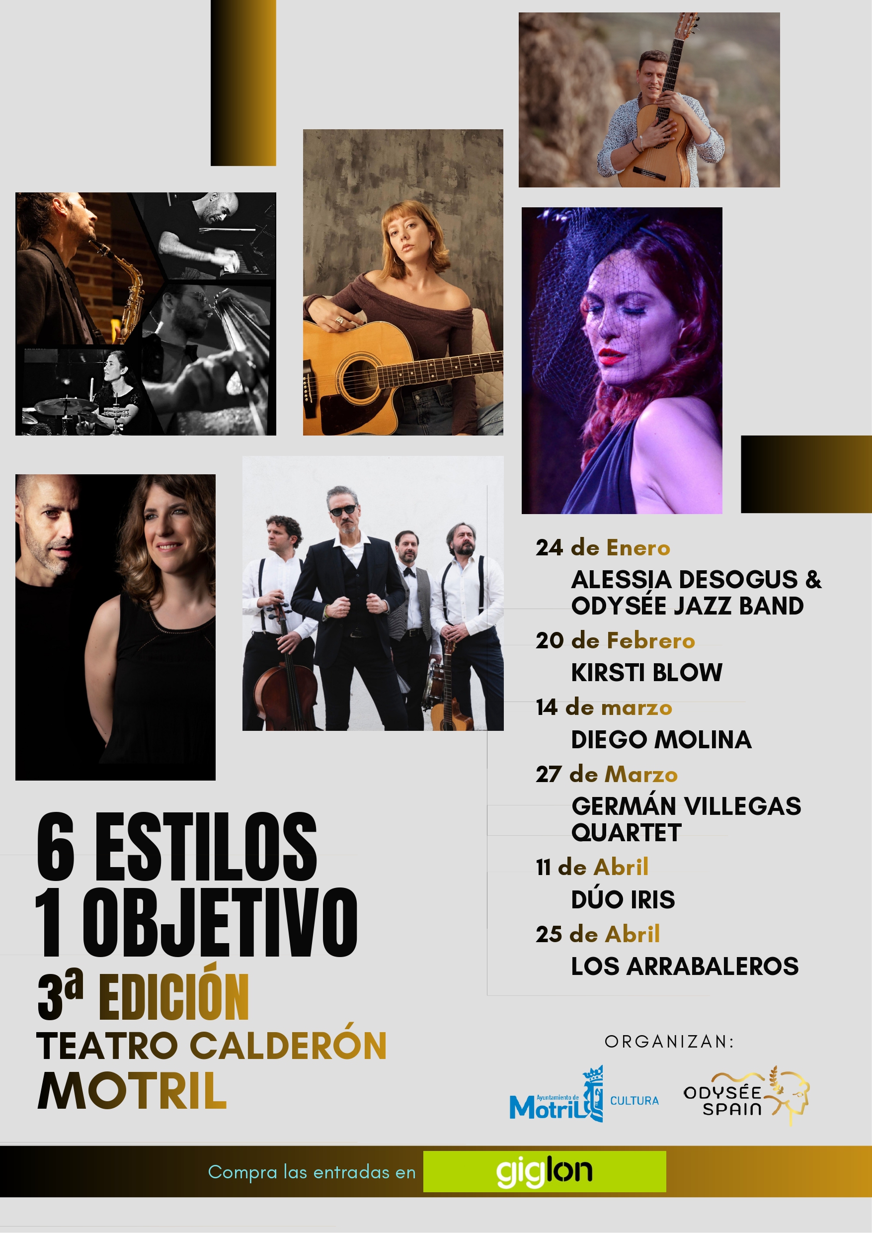 El Festival “6 estilos, 1 objetivo” se desarrollará a lo largo de los próximos meses con la siguiente programación: el 20 de febrero Kirsti Blow (cantautora neoyorquina que recientemente pasó por el concurso de La Voz), el 14 de marzo Diego Molina (flamenco), el 27 de marzo Germán Villegas Quartet (jazz moderno), el 11 de abril Dúo Iris (música de cámara), y el 25 de abril Los Arrabaleros (grupo jienense de tango). Todos estos espectáculos se irán presentando conforme se acerque la fecha.