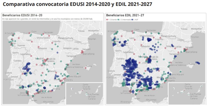 Estas subvenciones, que reciben el nombre de Plan EDIL, cuentan para esta convocatoria con una dotación un 30% superior respecto a las convocatorias denominadas EDUSI (Estrategias de Desarrollo Urbano Sostenible e Integrado) correspondientes al anterior periodo de programación 2014-2020. Asimismo, el número de proyectos seleccionados se ha incrementado un 40%, pasando de los 173 planes de la edición anterior, a los 242 de esta convocatoria.