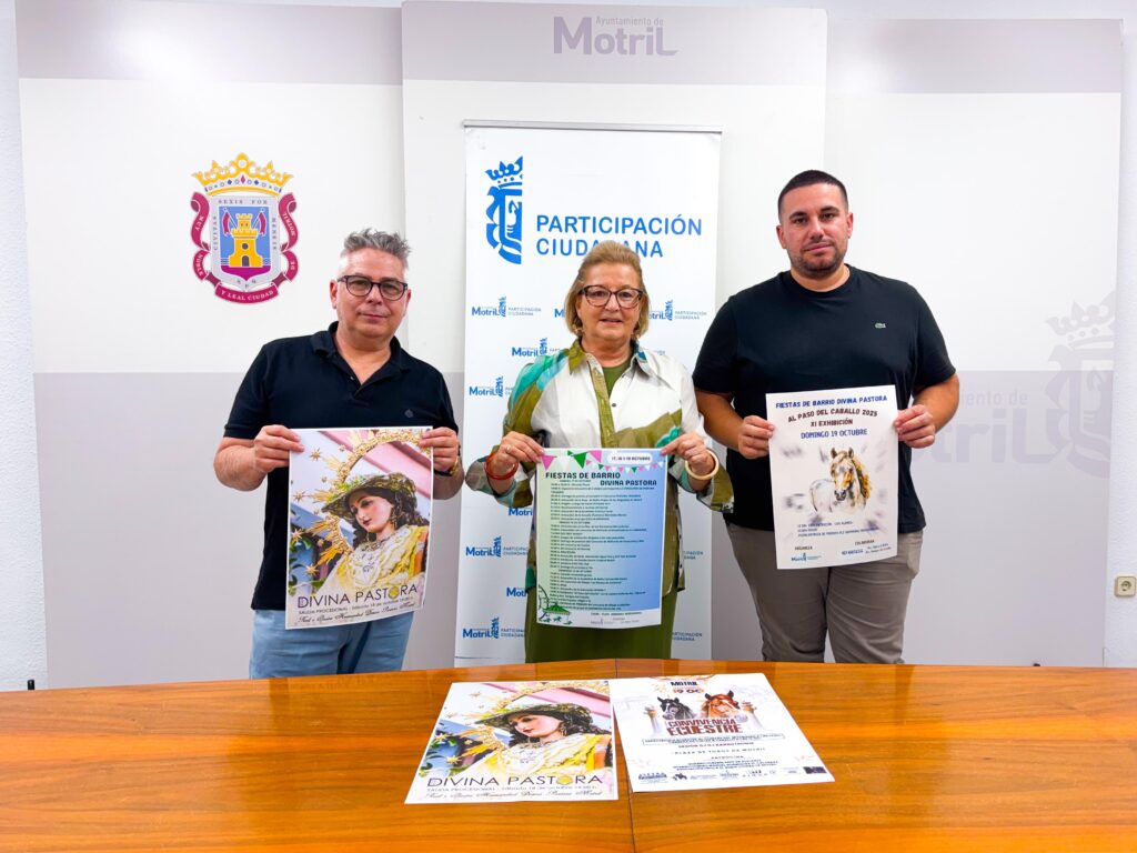 La teniente de alcalde encargada del área municipal de Participación Ciudadana, Inmaculada Torres, junto con un representante de la Real e Ilustre Hermandad Divina Pastora, Andrés Correa, y el vicepresidente de la Asociación Amigos del Caballo, Miguel Rodríguez, han presentado todos los eventos que se van a realizar con motivo de las fiestas del barrio de Capuchinos de Motril en honor a la Divina Pastora y que se celebrarán entre el viernes 17 y el domingo 19 de octubre con un gran número de actividades pensadas para todos los públicos.