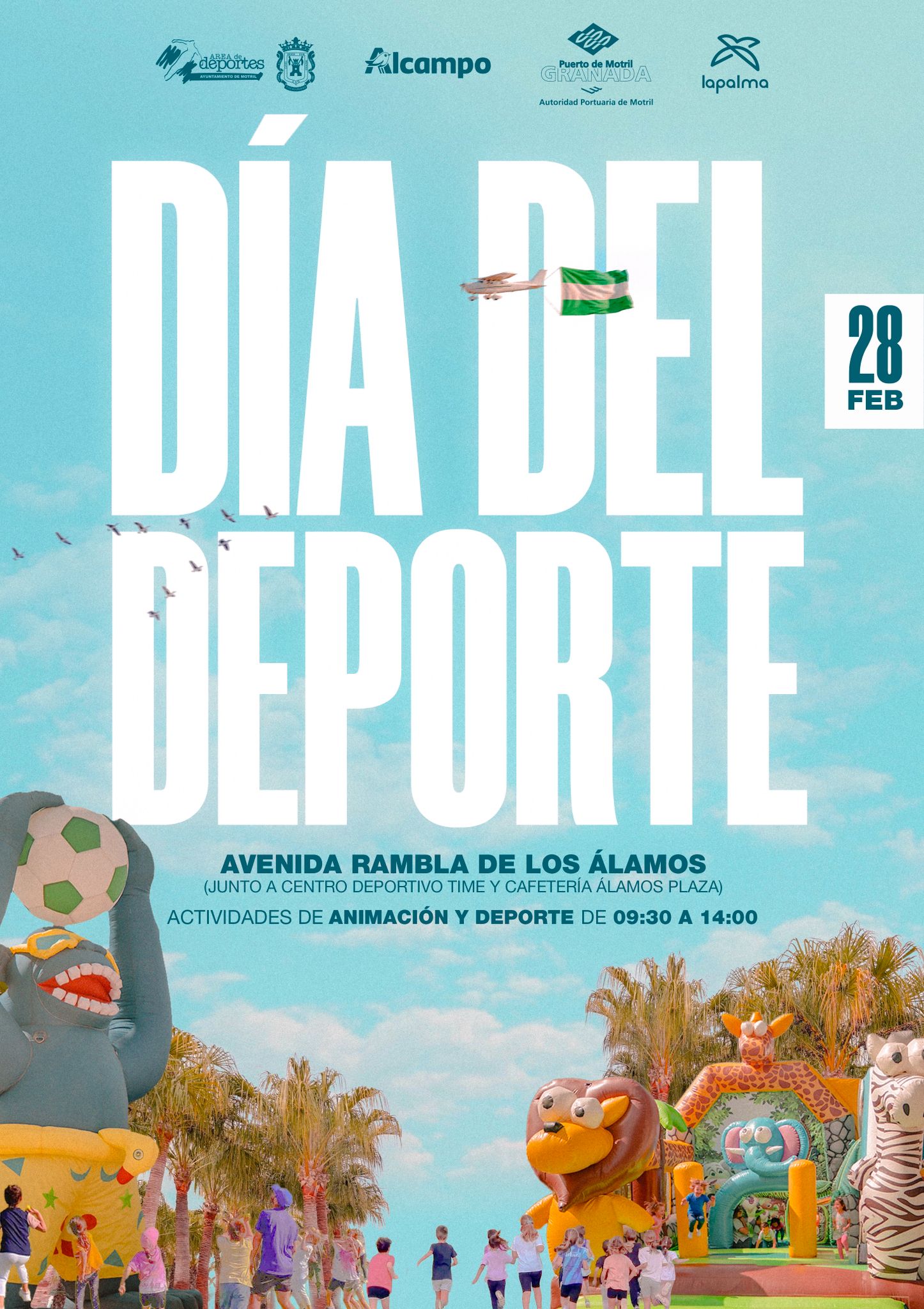 La jornada contará con una amplia programación de actividades deportivas y de ocio para todas las edades. Desde la zona del Centro Deportivo Time hasta la oficina del Distrito 3 del Ayuntamiento de Motril (Los Álamos) se instalarán diversos colchones inflables con temática deportiva, entre los que destacan: Pista americana, Conecta 4 de básquet, Bungee run, Barredora, Toro mecánico, Ninja Warrior, Montaña rusa, Portería hinchable.
