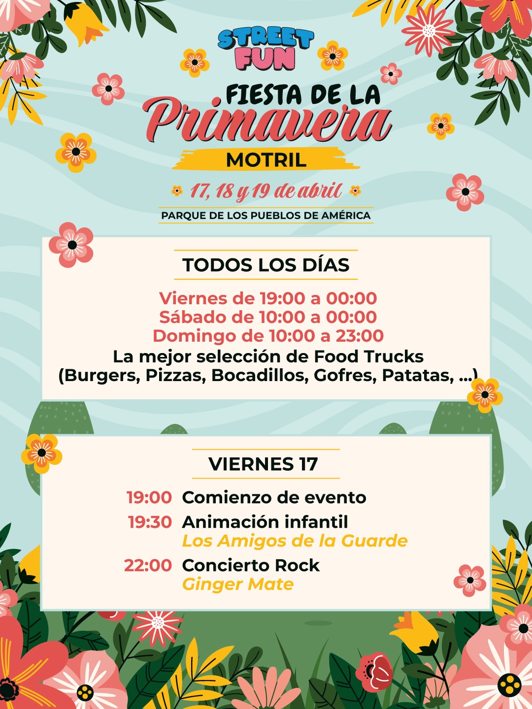 Desde el Ayuntamiento de Motril se ha organizado este evento para que todos los ciudadanos puedan disfrutar de una gran oferta de ocio, música y actividades muy diversas. El horario será el viernes desde las 19:00 horas, con la inauguración oficial, hasta las 00:00 horas; el sábado de 10:00 a 00:00 horas y el domingo desde las 10:00 hasta las 23:00 horas. Además, durante todo el fin de semana, los motrileños podrán disfrutar de una gran variedad de food trucks con comida para todos los gustos (pizza, hamburguesas, tacos, gofres. etc.).