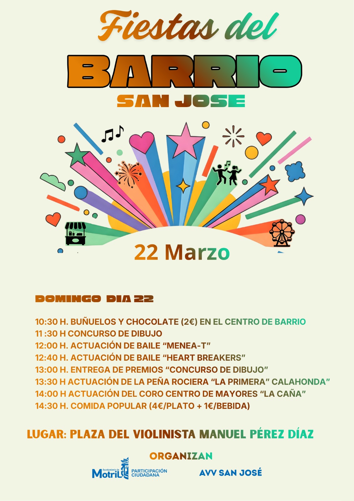Esta festividad por San José se celebrará el próximo domingo 22 de marzo en la Plaza Violinista Manuel Pérez Díaz y comenzará, a las 10:30 horas, con un desayuno común de buñuelos y chocolate al precio de 2 euros. Una vez finalice, comenzará un concurso de dibujo y dará paso a diversas actuaciones musicales por parte de las academias Menea-T y HeartBreaker Dance Studio. Antes de la comida popular, que será una paella a las 14:30 horas al precio de 4 euros, el barrio vivirá la emoción y la pasión más arraigada con la actuación de la peña rociera “La Primera” y el coro del Centro de Mayores “La Caña”.